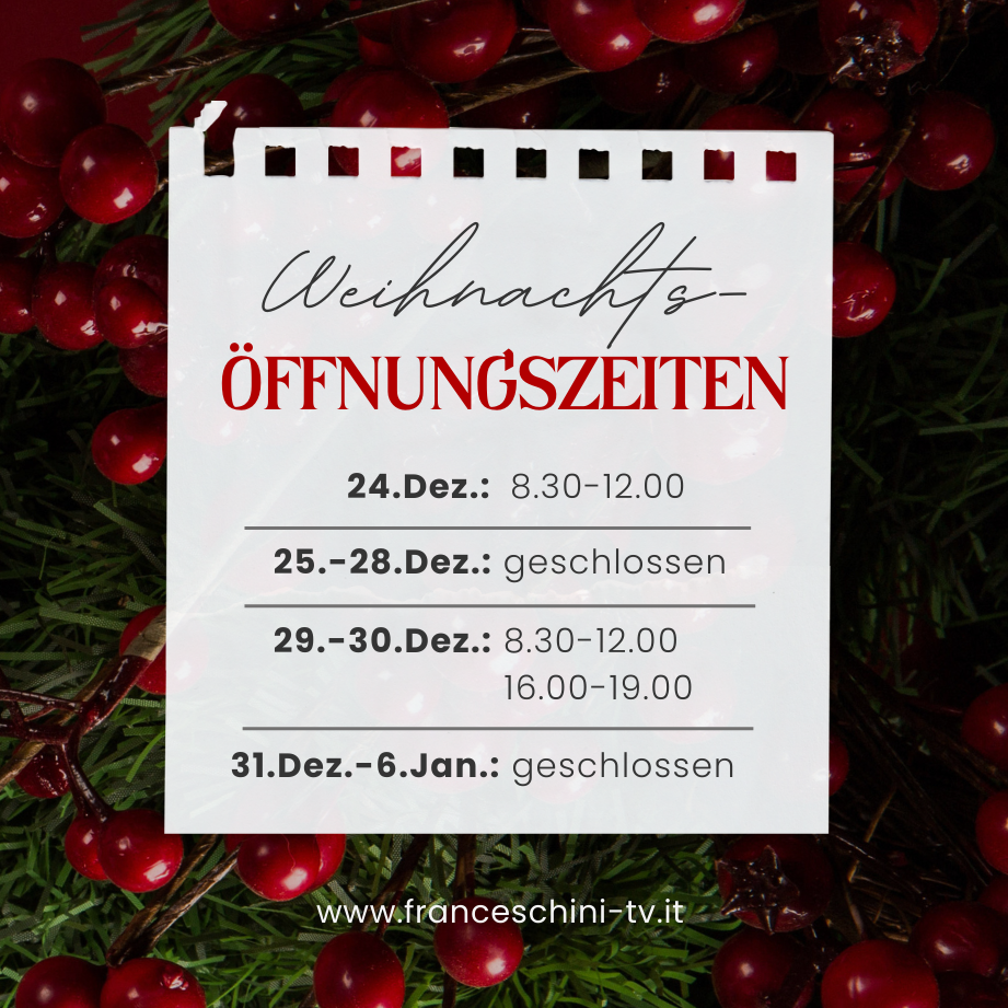 Die Firma Franceschini TV ist als familiengeführter Betrieb schon seit 1970 im Bereich Fernsehgeräte, Antennenanlagen, Audiosysteme u.ä. tätig und betreibt zudem eine eigene Werkstatt für kleinere Reparaturen an Geräten und Anlagen ihres Sektors. Ein Schwerpunkt neben einer fachgerechten Kaufberatung ist die Betreuung der Kunden und die Wartung der Geräte.